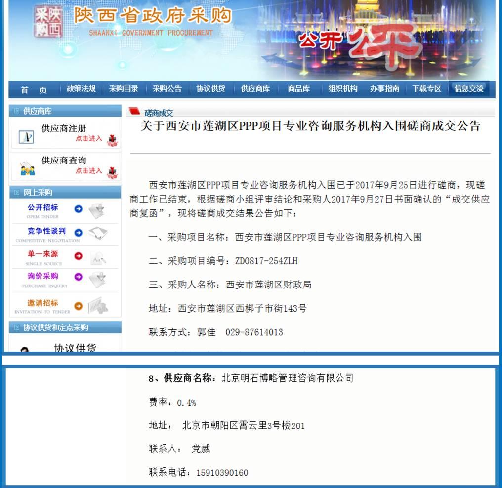近日,北京明石博略管理咨询有限公司成功入围西安市莲湖区PPP项目专业咨询服务机构库,为公司在陕西省开发PPP咨询服务项目奠定了基础。截至目前,明石博略已在江西省、青海省、海南省、山西省、内蒙古自治区、锡林郭勒盟、青岛市、咸阳市、运城市、永济市、日照市、侯马市、西安市等数十个省、市完成PPP咨询服务机...