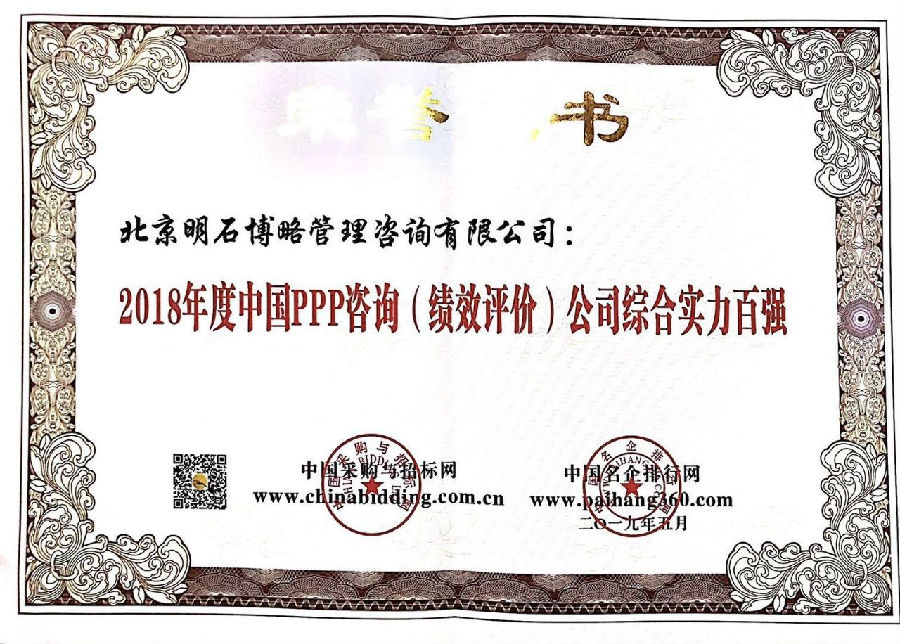 主办单位发布的“2018年度中国全过程工程咨询公司综合实力百强榜”等系列榜单明石博略所获奖项是:2018 年度中国 PPP 咨询(绩效评价)公司综合实力百强。