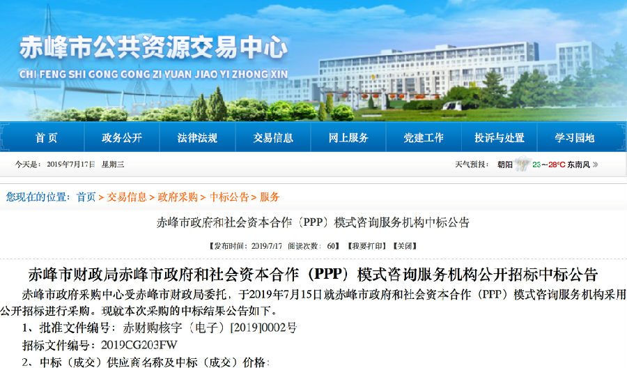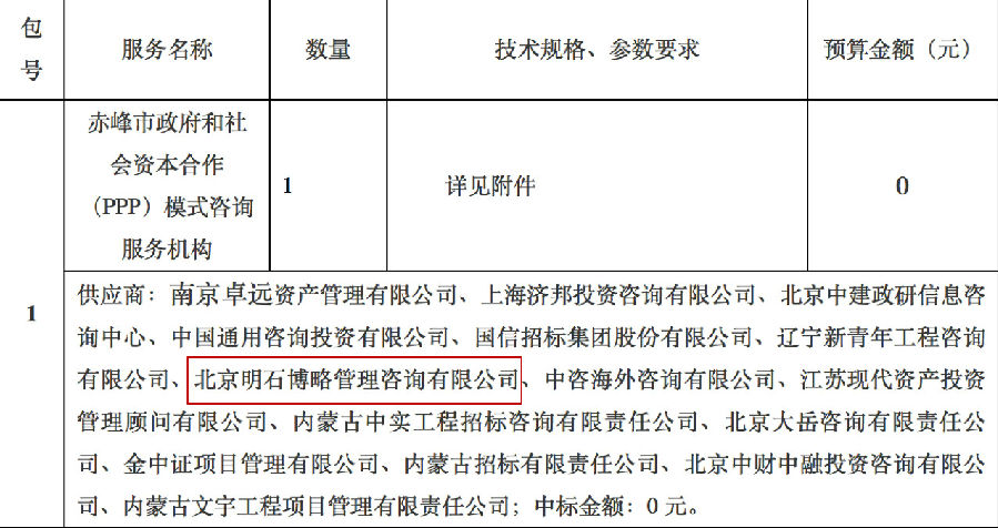 2019年7月15日,赤峰市财政局委托赤峰市政府采购中心就赤峰市政府和社会资本合作(PPP)模式咨询服务机构采用公开招标进行采购,北京明石博略管理咨询有限公司凭借自身丰富优质的PPP项目咨询案例及强大的专家团队成功入选PPP咨询服务机构库。
