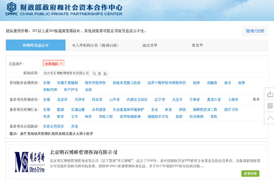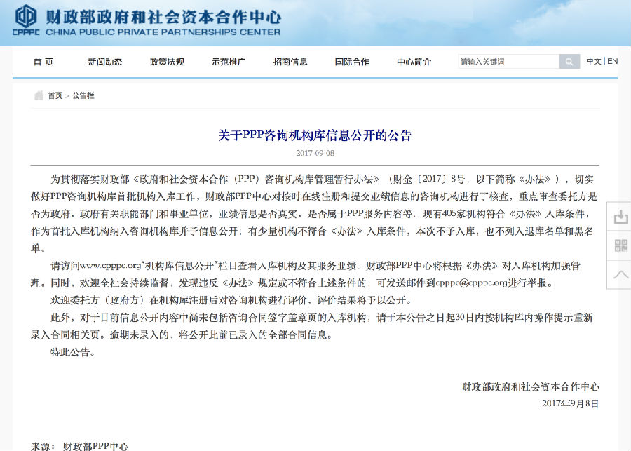 近日,财政部PPP中心发布了《关于PPP咨询机构库信息公开的公告》,共有406家机构入选财政部首批咨询机构库,北京明石博略管理咨询有限公司入选其中,并位居前30名。