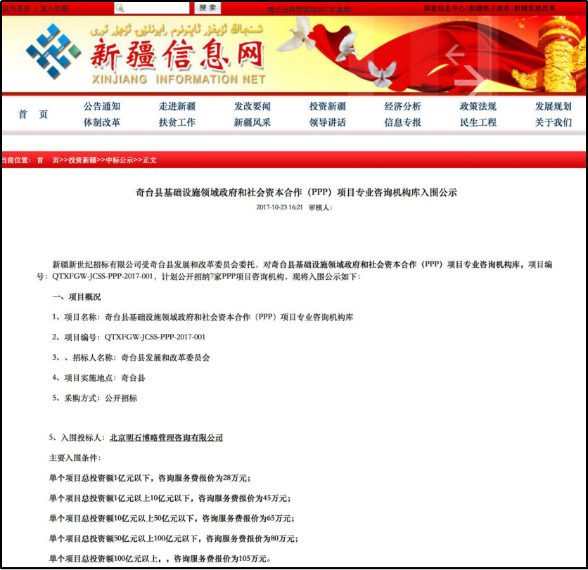 近日,新疆维吾尔自治区奇台县发展和改革委员会计划公开招纳7家奇台县基础设施领域政府和社会资本合作(PPP)项目专业咨询机构库,明石博略凭借自身丰富的PPP项目案例及优良的信誉成功入选。